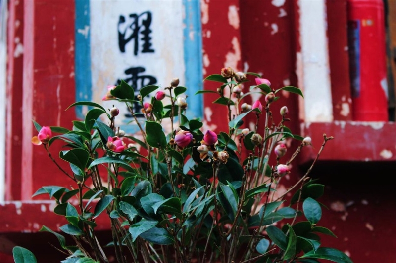 鼓楼外的墙角摆放着水红色的茶梅,一个个花骨朵含苞待放,像是害羞的小姑娘微微低着头,躲在碧绿革质叶子里。一株株茶梅以鼓楼的红墙做背景,又是另一种美丽。