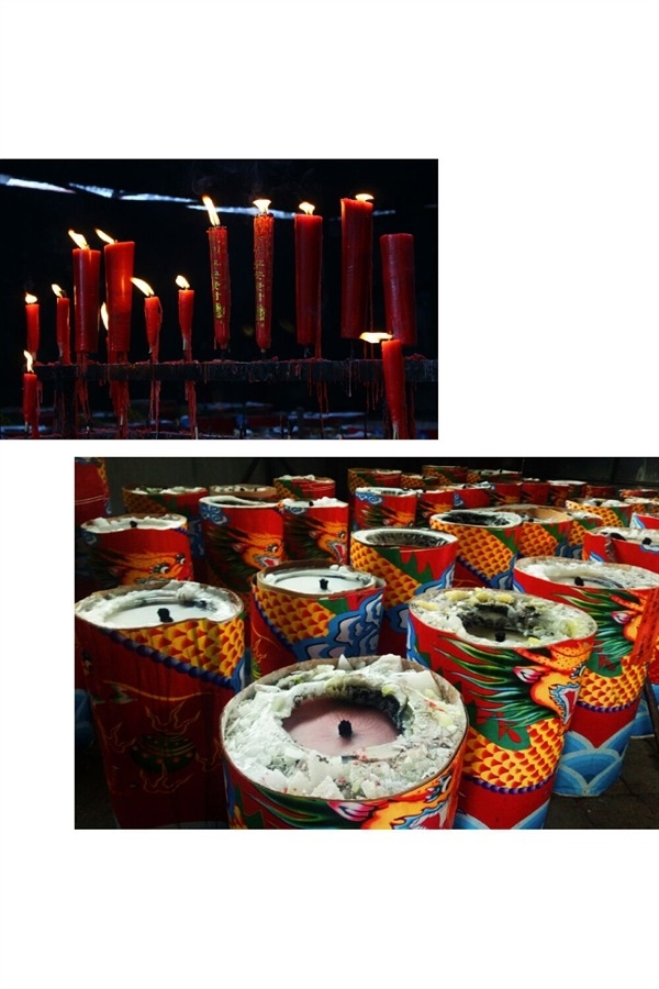 从石桥走过,走进正对着的一间屋子,这里烛火通明,一根根红烛燃烧着,烛火随着微风摇晃着,不时发出噼啪声,火焰也使这里显得格外的暖和。小的红烛边上还有巨型的蜡烛,它们外边包着龙文彩纸,像一段段树墩一样排在这里,虽然没有点燃,但是已经可以看出点燃后这里会有多少震撼。