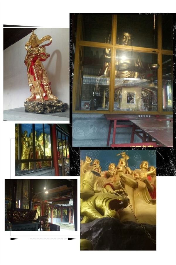 再往里开始,才算是真的佛堂,也有漆金的五百罗汉墙,有我们熟知的降龙伏虎罗汉,有金闪闪的二郎真君,也有各种菩萨、佛祖等。还有房梁,回廊上的满是雕梁画栋,雕刻着各种精细的图案,而且漆着各种彩漆,简直不是一般的华美。
