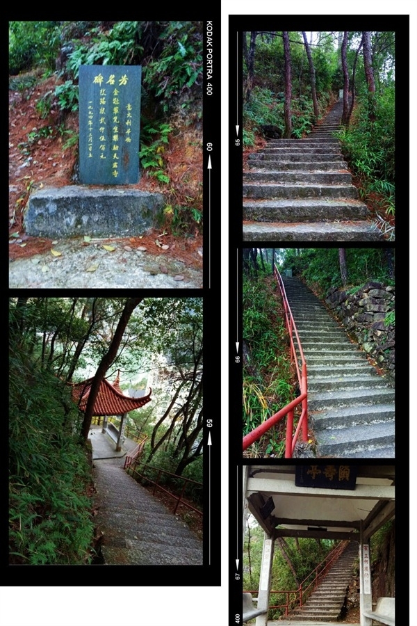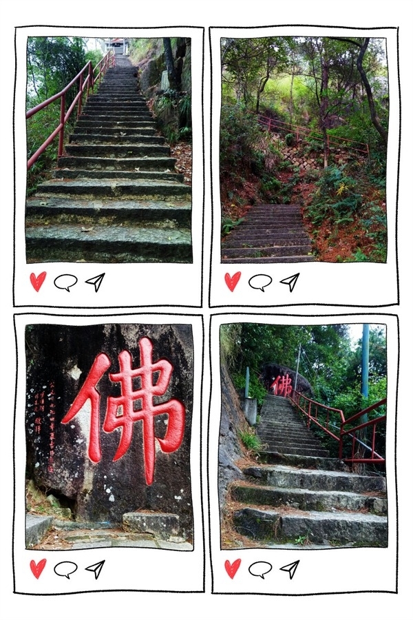 走过山门,就看见上山的阶梯,远处的一块花岗岩石头上,一个巨大的殷红色“佛”字,在周围茂盛的植被承托下显得格外醒目。石头铺就的台阶一层一层盘旋而上,仿佛是给前来朝圣的信徒带来一点点阻碍,让其洗脱心灵的尘埃,此时的心情也显得格外虔诚起来。