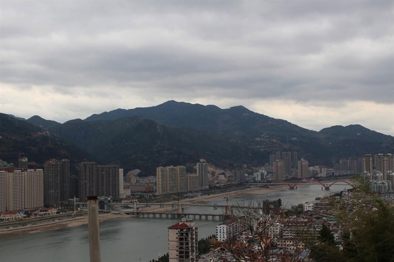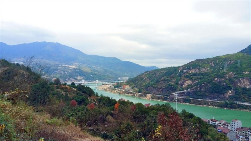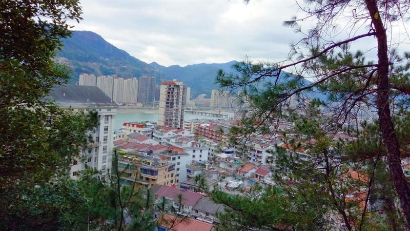 瓯江对面的高楼一丛一丛,山下的房屋摩肩接踵,它们都是红色的房顶,在瓯江的绿水环绕下显得格外亮丽。整顿休息过后再往山上去,这个季节算是冬天,但是山上还依稀留有没有落尽的秋叶。