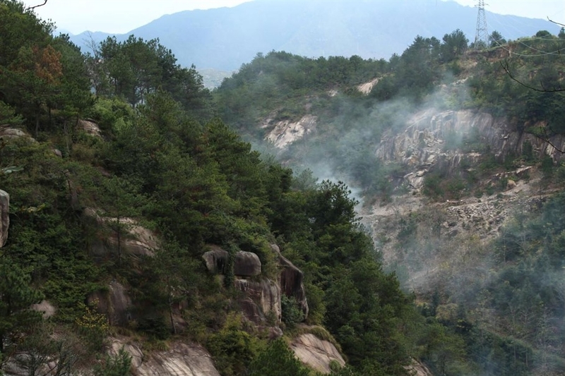 天岩宫的后山,裸露着花岗岩的山体上长的满是青松。山谷深处还升起云雾,犹如仙境。