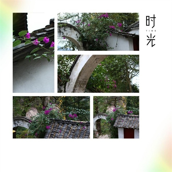 天岩宫后有一小院子,有个秀气的圆形拱门,拱门的一角爬着一丛开着水红色花朵的三角梅,三角梅的颜色衬着青瓦,犹如江南姑娘般的温婉秀气。