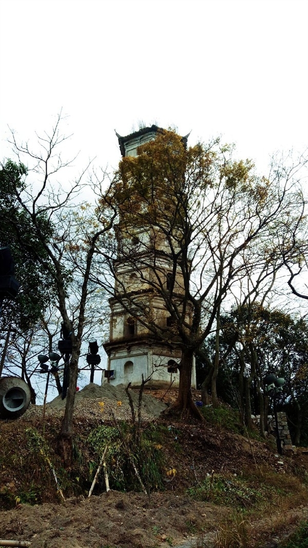 爬至山顶,这塔被一圈的枯树围绕着,有的树的秋意还未落尽,还依然挂着满头凌乱的枯叶,迟迟不肯进入冬天的样子。