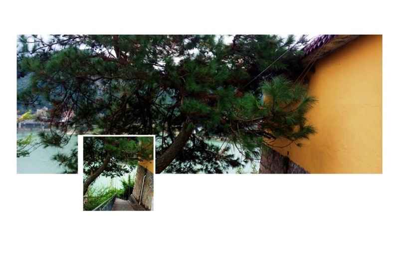 庙外的前体斜靠着一棵马尾松,它像是喝醉了酒,就那样靠着墙体,扶都扶不起来的样子,简直像个耍赖皮的小孩。不过绿色的松枝,在黄色墙体的衬托下显得格外好看。