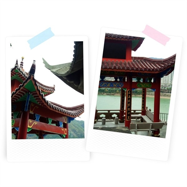 再往下又有两座建在山崖上的亭子,一座是四角飞檐的红色木质亭子,一座为石雕亭子,这里也是远眺瓯江的一个好的观景平台。