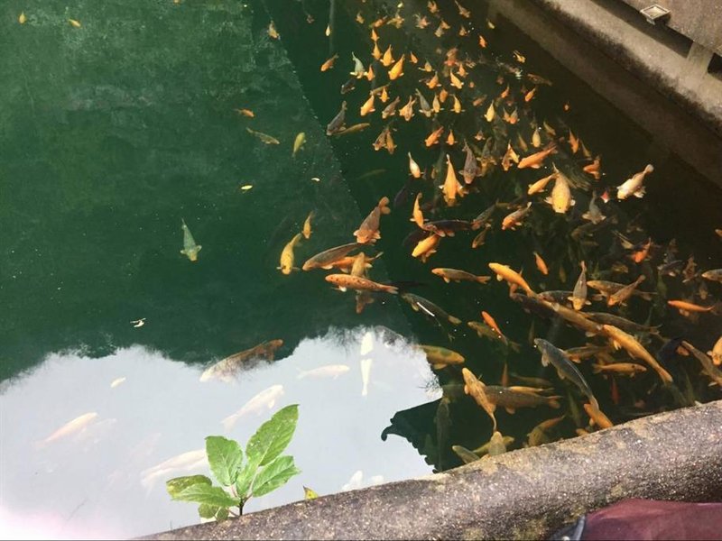 稍稍往里走入目的便是湖青见底的一汪湖水,更让人惊喜的是湖里有许多颜色各异的锦鲤,淡雅的湖青与亮眼的锦鲤摩擦出一种不同的视觉效果,使得人的内心变得十分宁静。