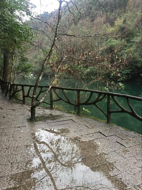 这里空气清新宜人,幽步于小径之中,感受着丝丝细雨的洗涤,享受着芬芳的泥土气息。此刻我们无须撑伞,只须用一颗虔诚的心,一双明亮的眼睛,观看这朦朦胧胧的画面。耳边一阵阵或麻雀,或虫蝉的叫声,掺杂着潺潺湖水的流淌声,像一首跌宕起伏的曲子,或低沉、或婉转、或高昂、或激进;豪迈是它、俊秀是它、奇险是它、温柔是它、突兀也是它;真是像极了人生百态的模样。远处的山峦,被薄薄的雨雾蒙住,渲染了一副朦胧的画面,看起来仙气弥漫。在这样一副养眼的细雨篇幅中迈出自己的脚步,也该是件极为惬意的事吧。