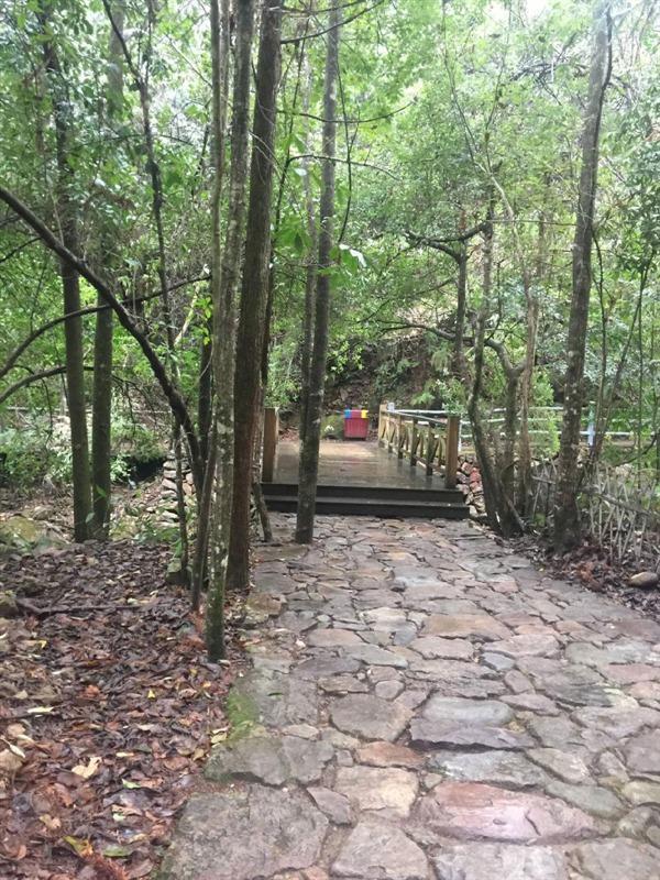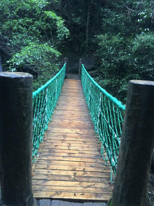 往山中深处行走的过程中,你会看到许许多多的架桥,其中最让我映象深刻的是一座底部由木板组成,两侧由绿色塑料绳子编织而成的桥。桥的两端由绳子固定在两个木桩之上,走起来就像索道桥一样,摇摇晃晃的分外刺激,安全级数也是极高的。像我这种贪玩的人都生生在桥上跑了好几个来回呢!