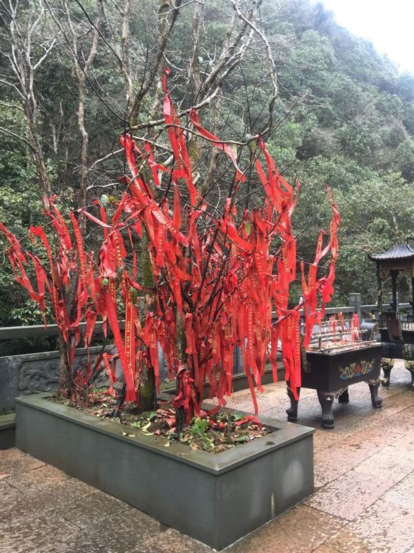 顺着小径向上走是形状各异的石块铺就的道路。有水泥铸就的,有鹅卵石铺就的,也有大理石块铸就的;真是形态各异,美不胜收!在小径的旁边种这不同类型不同种类的树木,有枝长坚挺,蜿蜒直上的,有秀美淡雅,含蓄和美的,更有形色怪异,引人注目的。那一树树的叶子绿得发亮,绿得鲜艳,像新生的婴儿一样充满了生命力,总之,千奇百怪的树真是让人看的眼花缭乱,目不暇接。当然树中自然是少不了许愿树啦,在特殊意义以及被佛庇佑或是开过光的树上,有不少的信男信女真挚的祈祷与祝愿,一条条红绳悬于书上,一阵微风袭来,红绳竟如活过来一样在空中轻轻飞舞,好看极了!