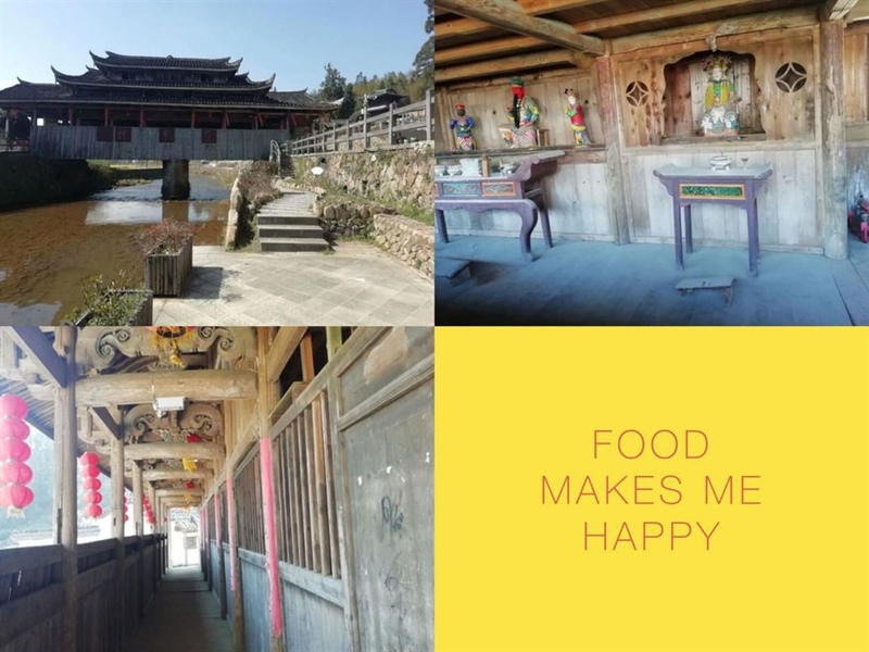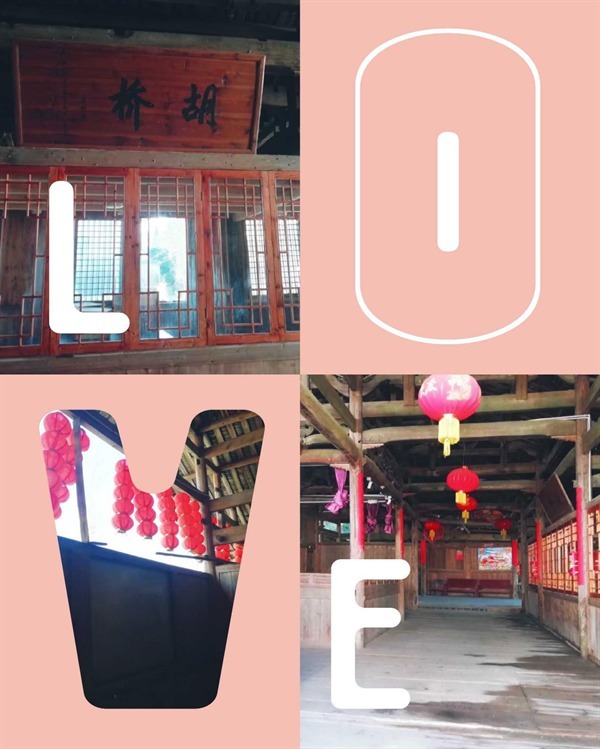 我顺着曲曲折折的道路向前行,便到了胡桥。说是一座桥到不如说胡桥是一座老屋,全木结构的胡桥仿佛是一个年迈的老人拖着羸弱的身体还立在哪里。老旧的木地板,因年代久远潮湿霉变的横梁,中间有个古戏台,是以前表演木偶戏的场地。横梁之上,架着一些以前表演的用具,底下落漆的红色木椅整整齐齐的摆放着,走进胡桥,无一不透着当年刚改革开放时代的气息。这座桥明朝时期便在这里,是一座典型的多功能廊桥,它的出现给人们带来了多少便利。