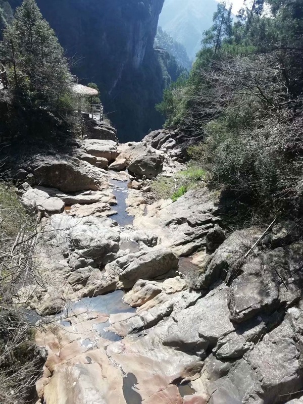 我沿着山道扶手往下走,一路上陪伴我的是悦耳的鸟鸣声和风过树叶沙沙的响声,在这深山老路上,只有我一个人独行,未见其他游客,许是这个季节,鲜少有游客来此处,曲曲折折的山道带着我上行下寻,终到了雪花漈。只是它与我想象中的不一样,我没有看到满天的瀑布从高处落下。而是很安静,在陡峭的山壁之上,只有一股小小的支流静静流淌着,也难怪我一路上未听见淙淙的流水声,这个季节的瀑布也是干涸的,你甚至都找不到雪花漈的任何蛛丝马迹,虽然未见雪花漈飞瀑如雪,有点遗憾,但是我不阻碍我看风景的心情。