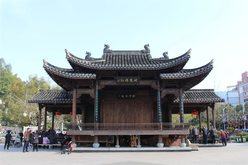 平昌广场上一座高大的戏楼热闹非凡,牌匾上的“姹紫嫣红”正是出自于汤显祖《牡丹亭》的戏文。