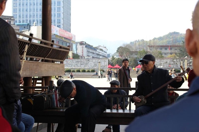 戏台边上的老人聚在一起,有的弹,有的唱,有的闭眼倾听,似乎因为《牡丹亭》,这里的每一位居民都是一个戏迷。