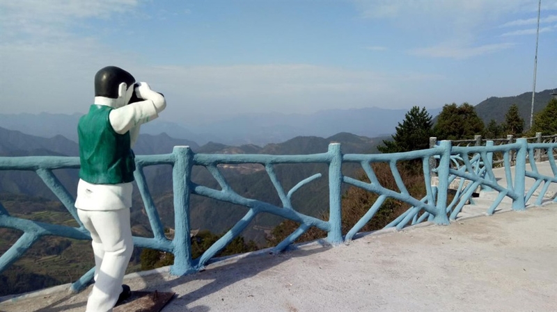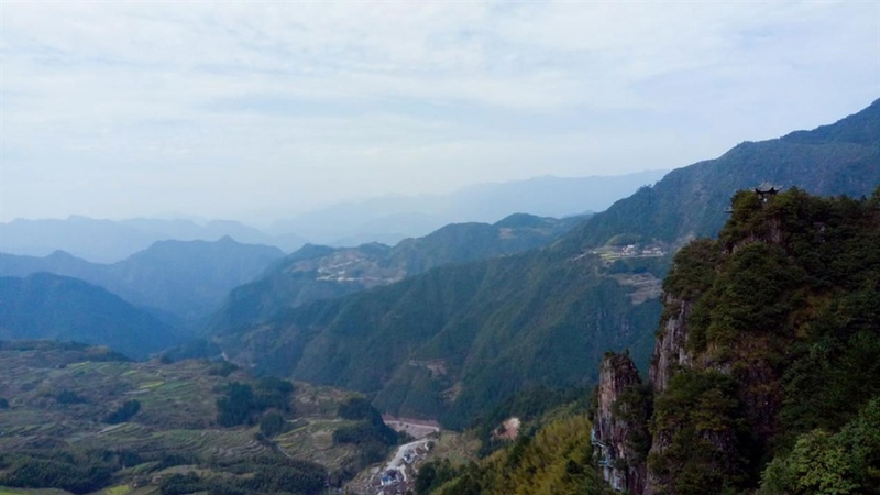 走过石碑,这里有一个很宽阔的观景平台,今天能见度极好,可以看到很远很远外的青山和底下成片的竹海。