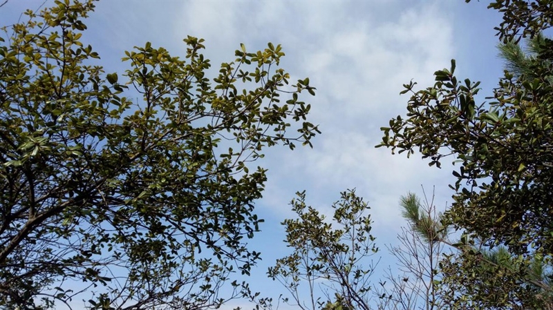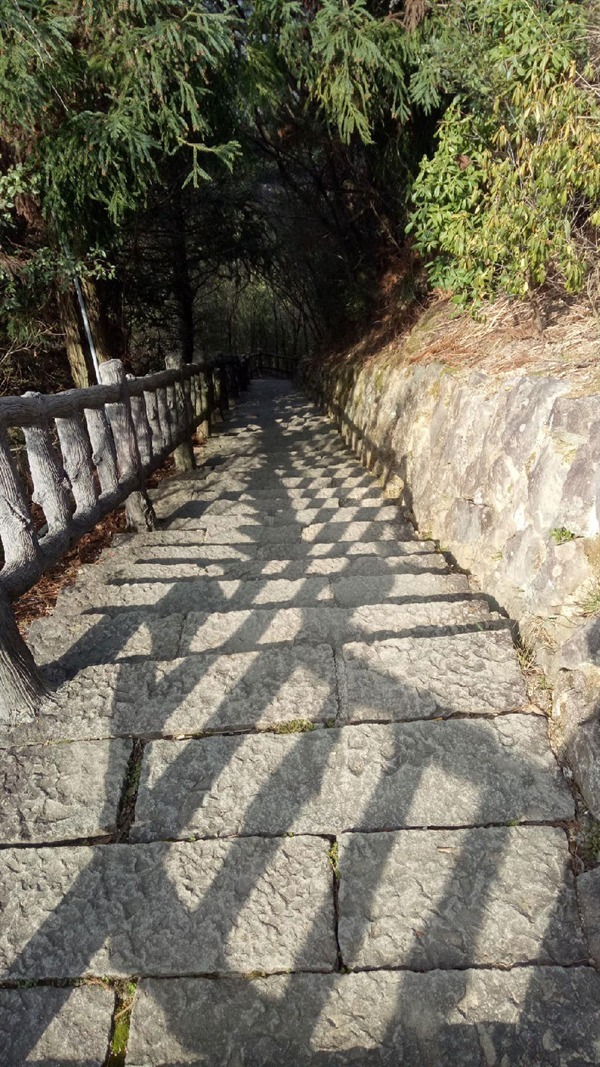 石阶上方的天空,被树木遮盖着,看着就像是一副树影画。
