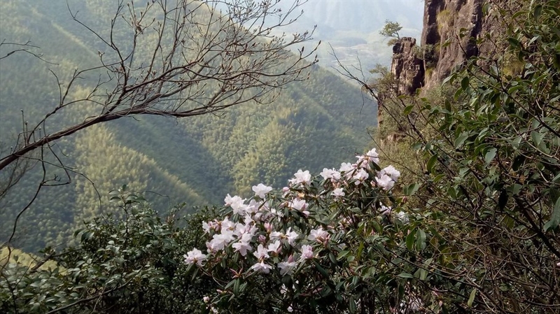 石柱边上的浅紫色杜鹃花也已经悄咪 咪地盛开。