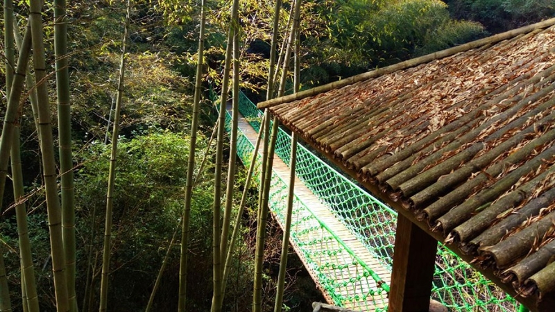 告别茶屋,遇见了一架吊桥,吊桥是绳索串联的,因此踩在吊桥上,桥就会开始摇晃,但只要抓着两边的绳索,内心就会突然安下心来。吊桥两边还是竹林,只不过有一条小溪涧穿流而过,就那样静静的流淌着,不激起任何一朵水花。