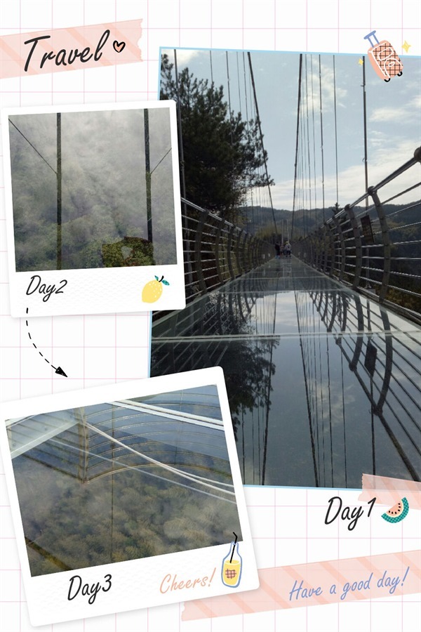 再往山上走,远远就看见了高空中的玻璃桥,那桥像是天梯,更像是一段五线谱,上面行走的游人,就像是五线谱上的音符。