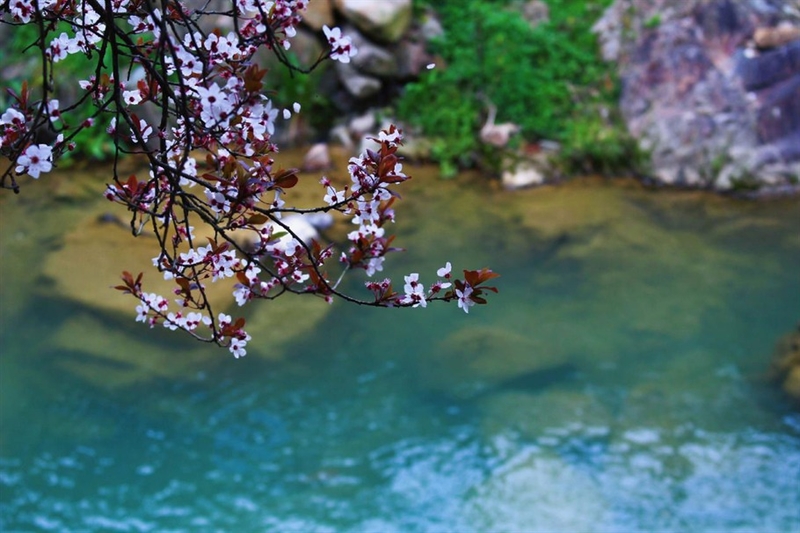 紫叶李依靠着溪边,一根枝条延伸向溪水,粉色的花怕是想去喝那溪里碧绿发着蓝光的清水了吧!