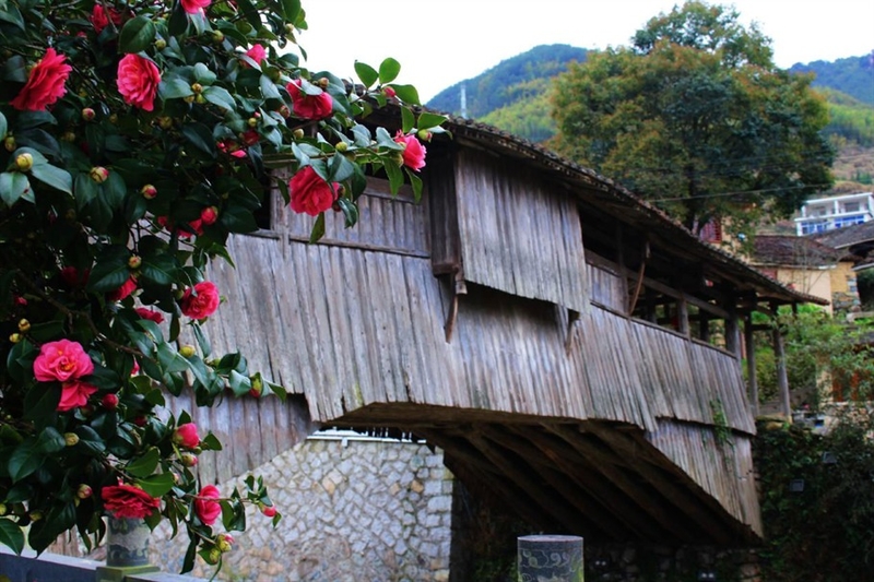 廊桥边的一株山茶花,玫红的花朵一团一团挂满了枝头跟碧绿的叶子相衬着,异常艳丽。