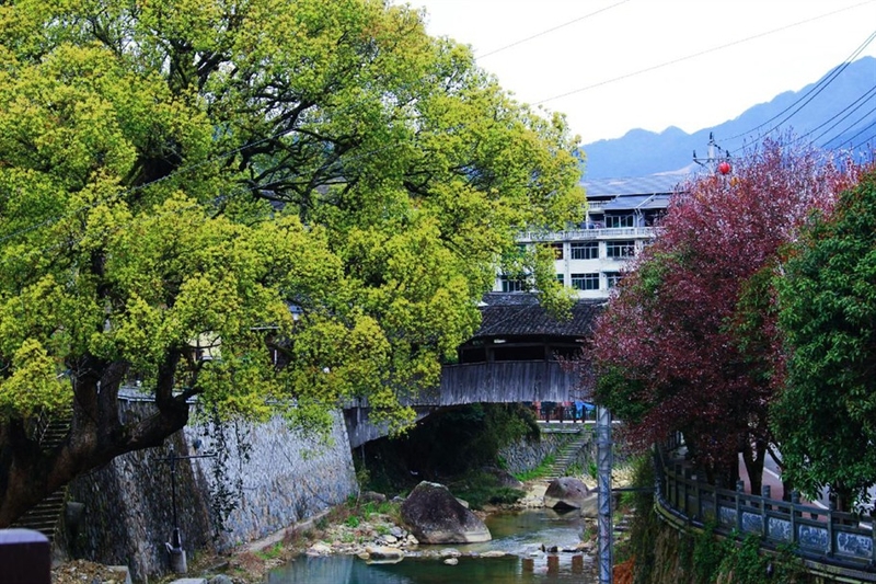 古朴的廊桥一边是翠绿的樟树,一边是紫红色的紫叶李,碧绿的溪水穿流而过,就像是一副山水画卷,充满着田园气息。