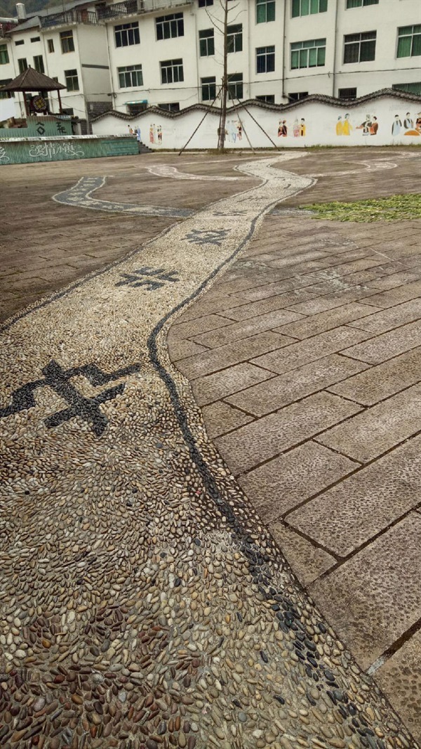 广场上有一条用鹅卵石铺就的畲族花带,上面还有畲族特有的图案。