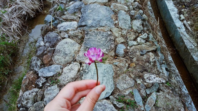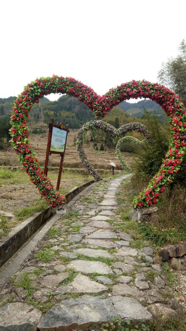 走到村尾,就到了这个爱情主题小镇的核心部分,穿过石头路,是一串爱心花环组成的门。