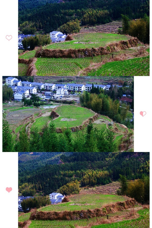 平台上可以俯瞰整个梯田的全貌,梯田最惊艳的部分就是那一块爱心形状的田块了,叫做“爱你在心田”。爱心的形状真的是超级完美,不知道梯田的建造者当初是不是有意而为之,这样太浪漫了吧!用现在的话说,这叫满满的仪式感。田里还没有种上作物,依然保留着去年秋收后留在田里的稻茬。阳光下,如果带上爱人来这儿一定会是一段浪漫的记忆。