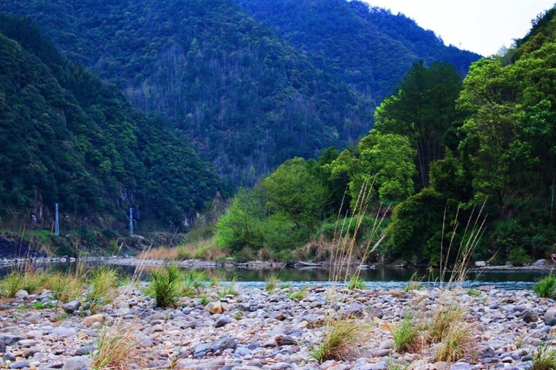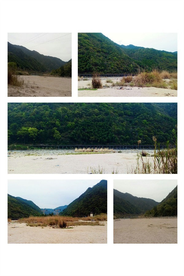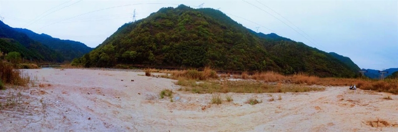 从公路的右侧向下走就到了大赤坑的沙滩了,这应该是河流将上游的泥沙带到这里,才淤积成大片的沙滩的。沙滩上还分布着一些茅草,要不是对面青山满是春天的绿意,不然这景色看着就有些萧条了。