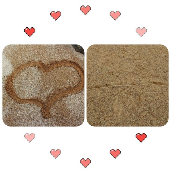 在沙滩上,这大概是所有人都会去干的事情,那就是去画心形,去写名字。画了一颗爱心还不够,再来一个一箭穿两心吧!不过我这技术,也就只会画爱心了!