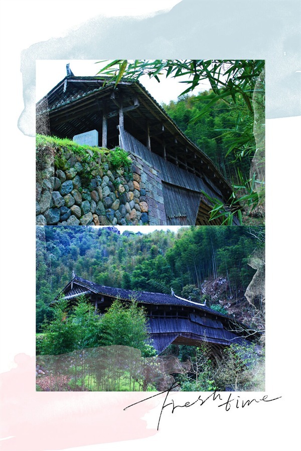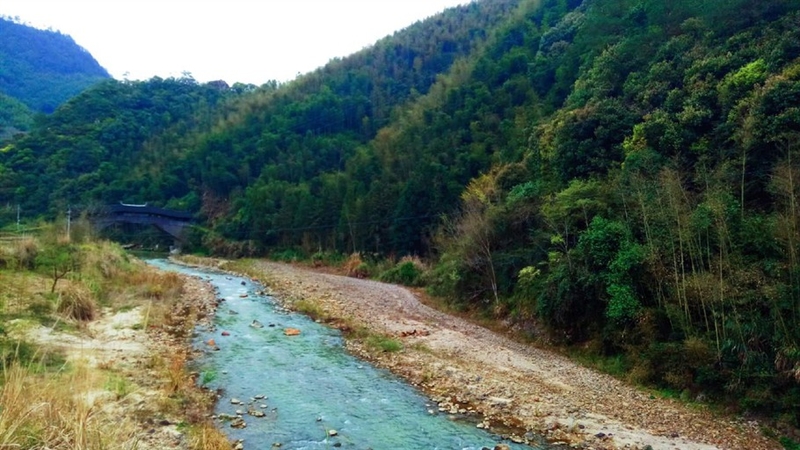 河流的上游架着一座廊桥,碧绿的溪水从廊桥底下穿流而来。青黑色的廊桥在绿水青山的映衬下显得古朴非常,透露出一股浓浓的年代感。