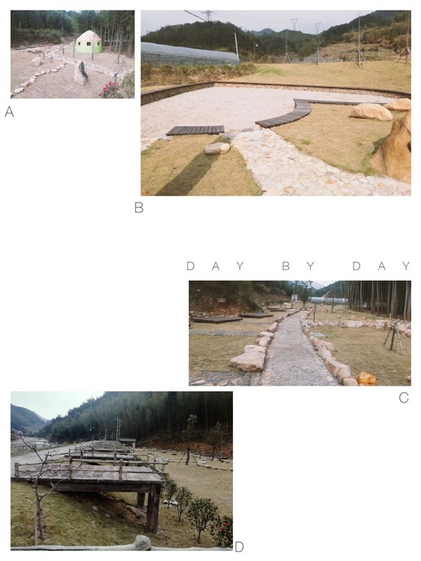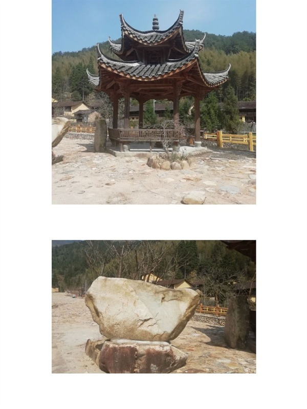 我从缓坡上去便是桃源村的游客集散中心。旁边的空地上用木桩围成了一个小小的展示台,青灰色文化砖铺成的地面上,在中心用其他石块围成了一个凤凰图案,身后是一大片水果大棚,种满了葡萄。