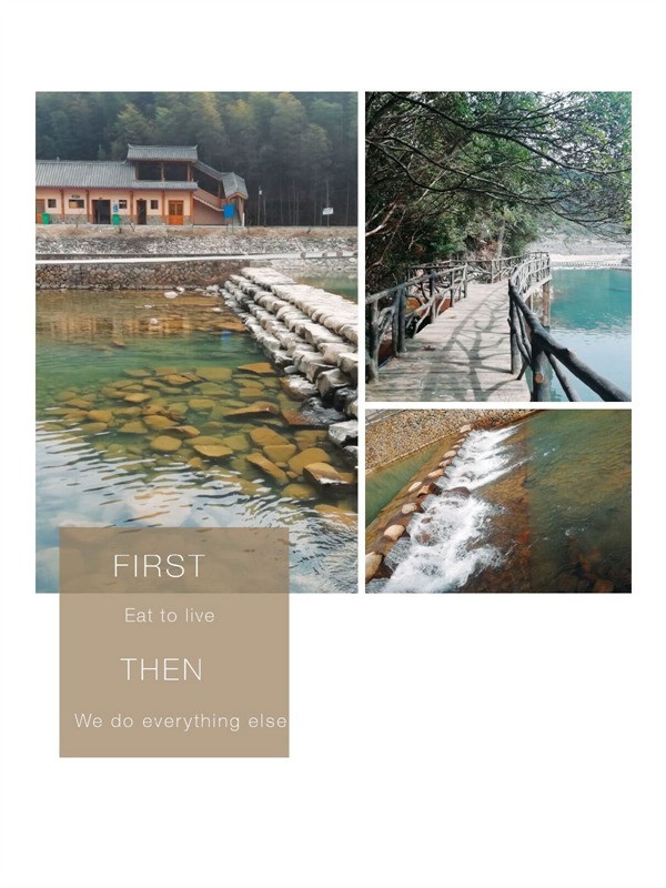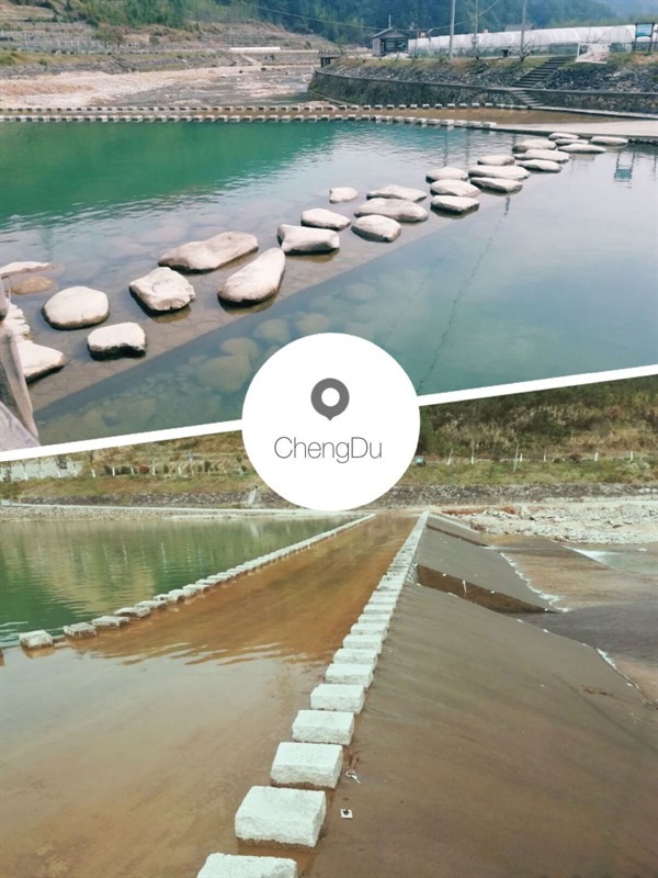 我站在半圆形的小 平台之上,观赏着沿岸的风景,脚下是淙淙流淌的溪水。不远处有个大坝横跨在溪流之上,堤坝之上,有大小均匀的石块给它做了个很好的分割,水很清,碧绿的溪水,明亮如眸,又如一面镜子般照亮了我的影子,它的绿似如翡翠玉镯一般绿的通透。