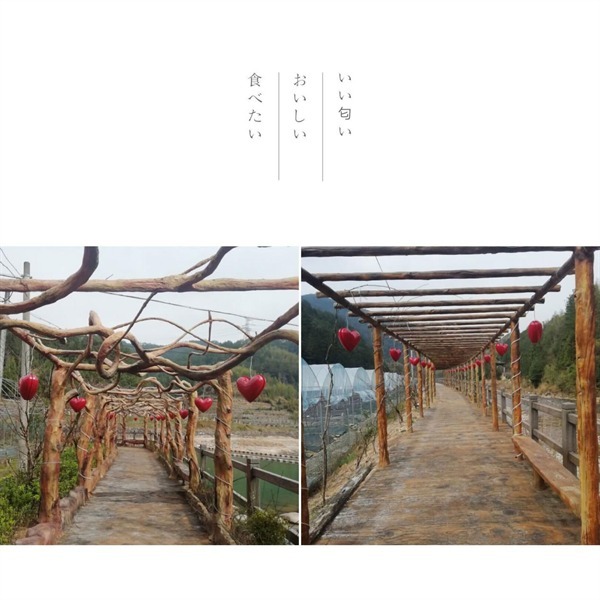 前方的场景倒是让我眼前一亮。两边是仿木柱的架子,顶上枝腾缠绕,相互扭转在一起,像极了葡萄藤,每个架子中心点都挂了个实心爱心,风吹而过,一排整齐的爱心轻轻晃动的,就如我们那颗躁动的心仿佛便要跳出心脏。走在藤架之下,仿佛走过了我梦中的婚礼,生活需要点仪式感,旅行也是。