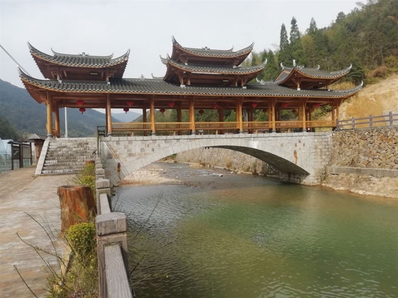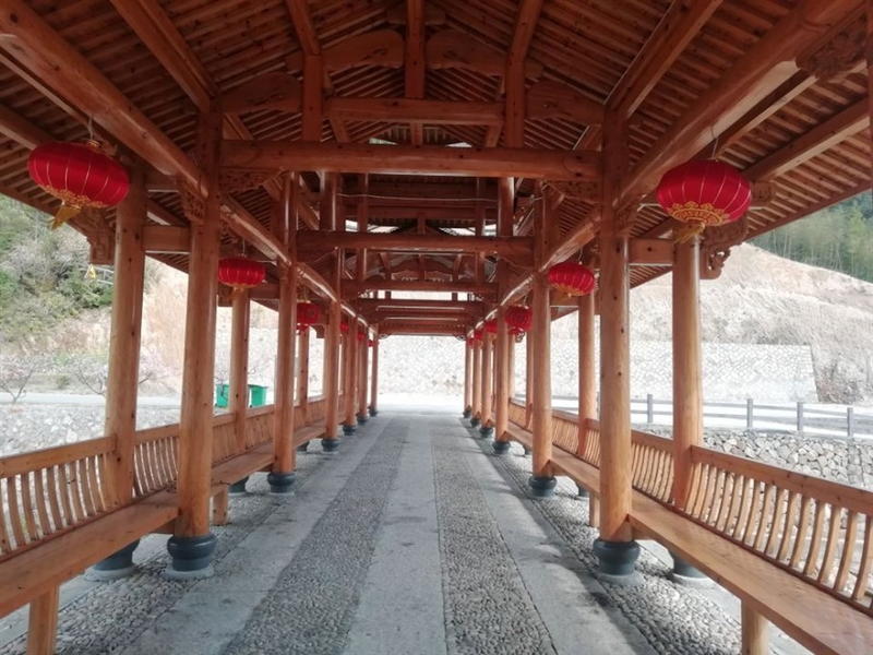 廊架的尽头是一座廊桥,没有年代的沉淀,看似是刚新建不久的廊桥,它横跨于两岸,气势宏伟,像一个威武的勇士镇守着堤岸。从廊桥上走过,环绕于柱子之间,横梁之下,两柱之隔,必有一个大红灯笼,红的喜庆。