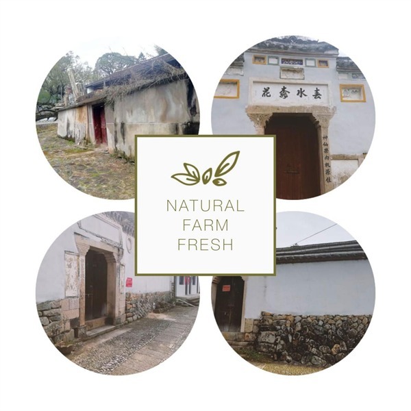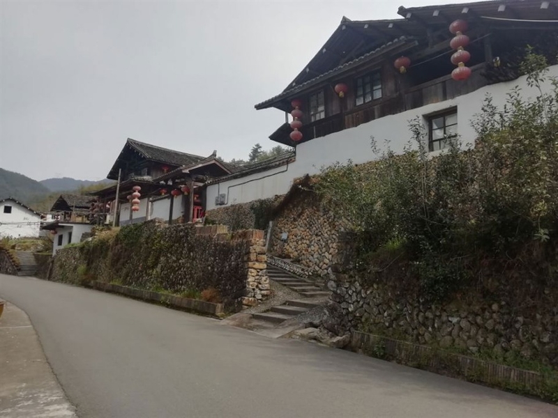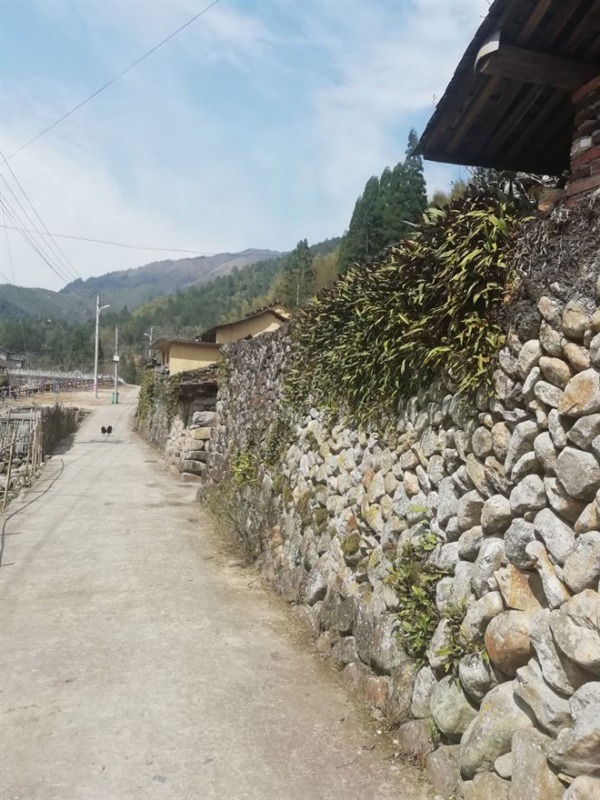 整个桃源村沿着马路,向马路两边一字排开。靠山这边每户人家门前都有个石块堆叠而成的围墙,因年代久远上面爬满苔藓植物,颜色不一的石块与苔藓植物相结合却有一种浑然天成的感觉,带着一种自然清新的味道。石径小路之上,便是几许人家,白色的墙面之上,灰青色的屋瓦,每一道都是靓丽的风景。也间或也有几许破败的小屋古旧的院门,感觉一碰就能轰然倒塌。