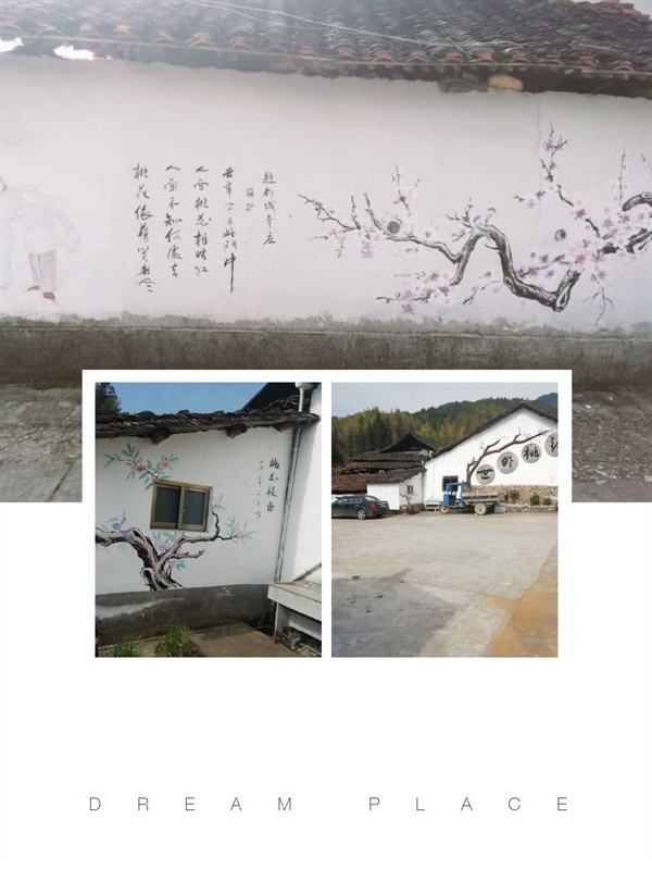 临近溪岸边的房子建于平地之上,我最喜欢墙面上那一幅幅壁画,简单的几笔就勾勒出了桃源村的场景,不浓墨重彩,透着几丝简笔国画的味道,却也完整的表达了桃源村的生活。白色的墙壁上还有很多题诗,并配以桃枝图案。那墙上绽放的桃花并未逊色于真实的桃花,反倒多了几许韵味。