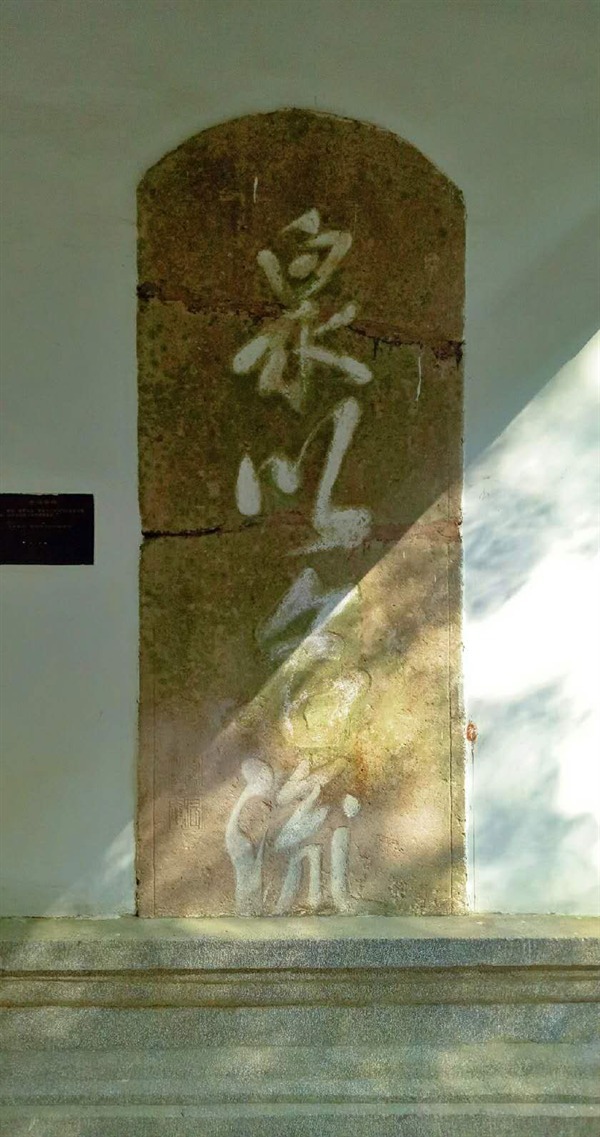 清嘉庆二年(1797),苍保任浙江提督,当年游览到此题字勒石,“泉以名流”。这几个字已经嵌进墙壁,石碑看似曾有断成三段的样子,布满岁月的痕迹。