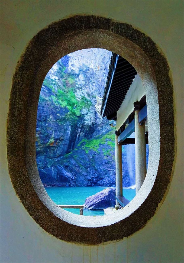 景区最核心的部分就是这石门飞瀑了,瀑布边的凉亭里,窗子是这样的椭圆形。从窗内望出去,瀑布的流水在亭子的遮掩下若隐若现,只清楚的听见瀑布跌落到水潭里的响声。