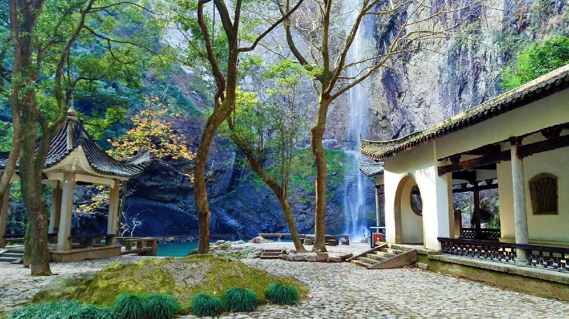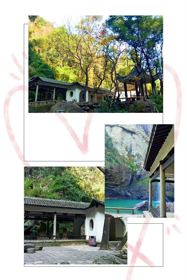瀑布下有一个碧绿碧绿的水潭,水潭边建了一座亭子,走进亭子,仰望一泄而下的山水,山风吹来还夹杂着一层水雾劈头盖脸而来。就有宋代诗人林景熙作诗一首云: