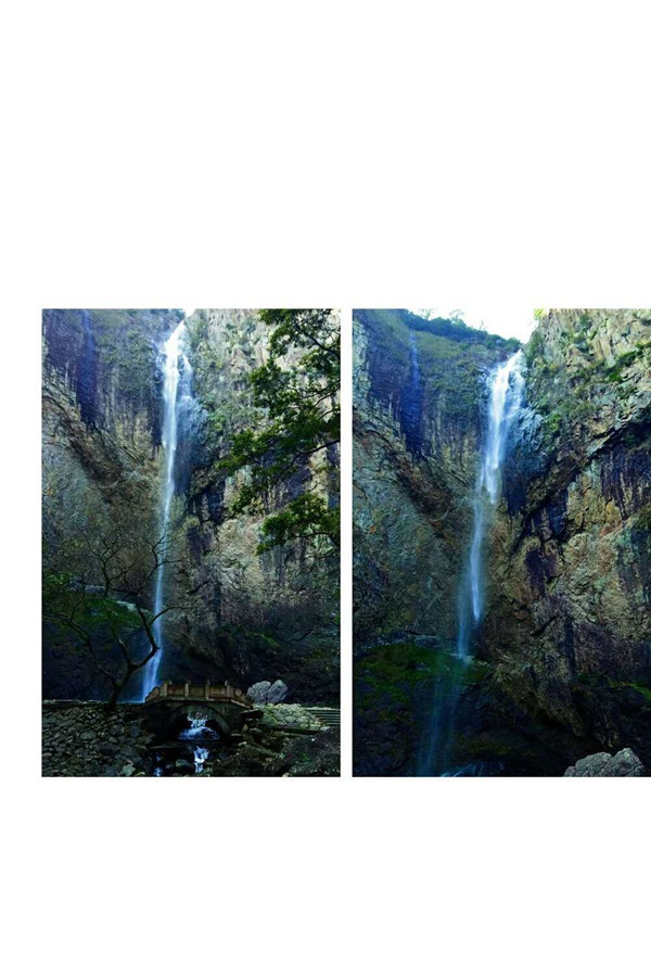 下到瀑布的正对面,也许是此时的山水并不是很多,看见这瀑布也不是垂直向下的。山风吹来竟然吹斜了那一缕从山顶跌落的细水,就像是吹起了哪位新娘长长的头纱。