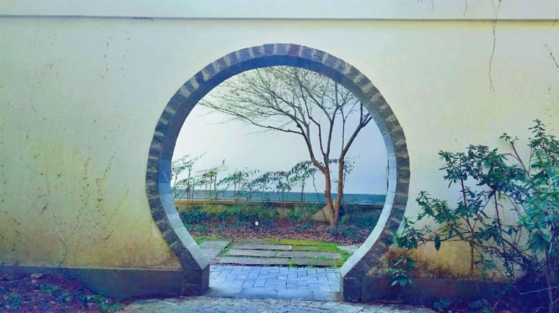 青砖砌起的圆形拱门,拱门的那边就像是一副画卷,仿佛那树下就有一个刻苦读书的少年。
