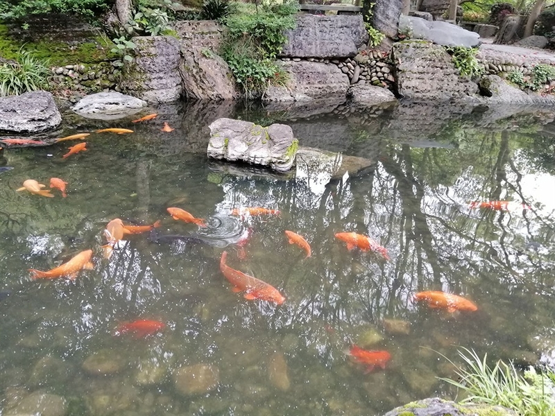 往上走小朋友就被一池金光灿灿的红鲤鱼吸引住了。我看着这一形似葫芦的小池塘,听说是依着济公活佛的酒葫芦建造。树影幢幢,潭中的红鲤鱼也游得好不欢快,联想到“子非鱼,安知鱼之乐”,快乐确实是一种私人的东西。