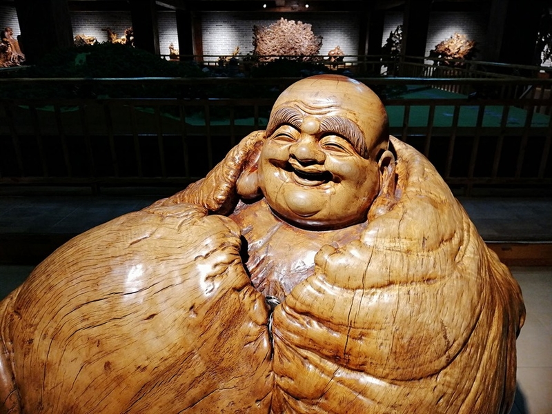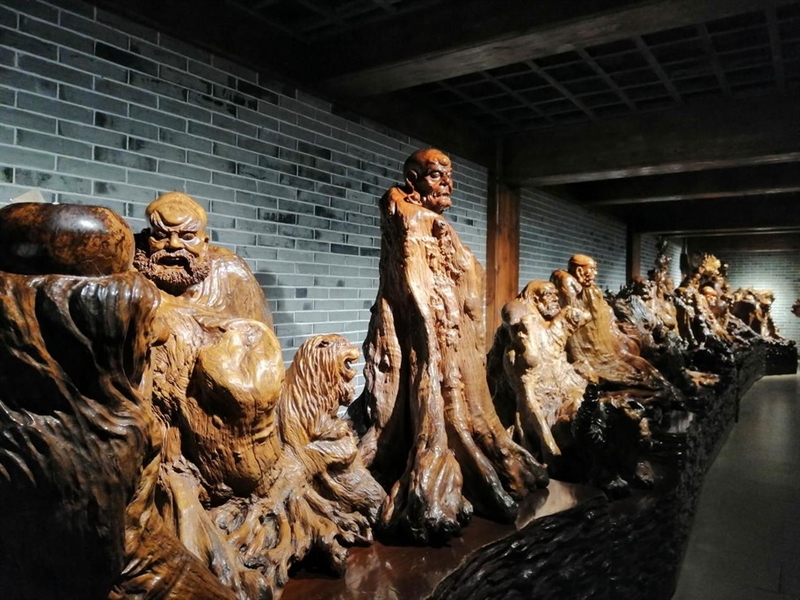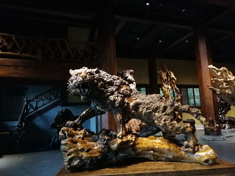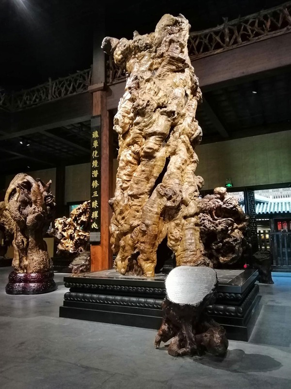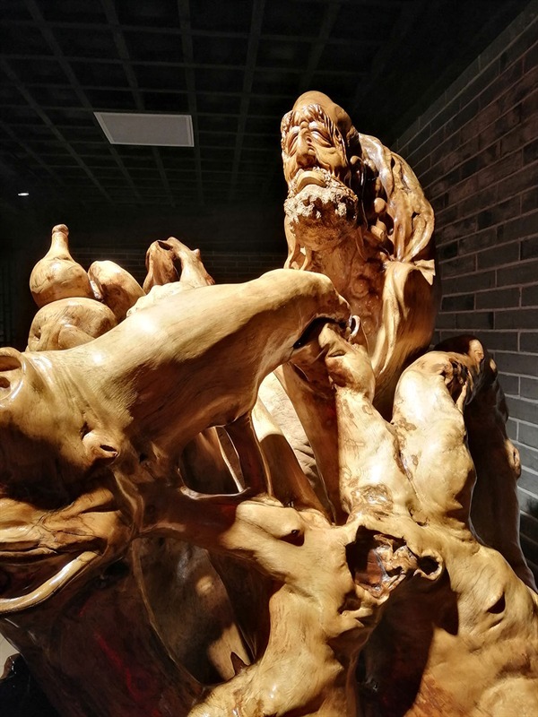 往里走,就到了“集趣斋”。正如名字那般,内里的物件也趣味无穷。慈眉善目的老者、直戳天空的春笋、笑容可掬的弥勒佛、向天空张开双手并张开口的某位尊者,等等千姿百态的根雕作品,另人会心一笑。