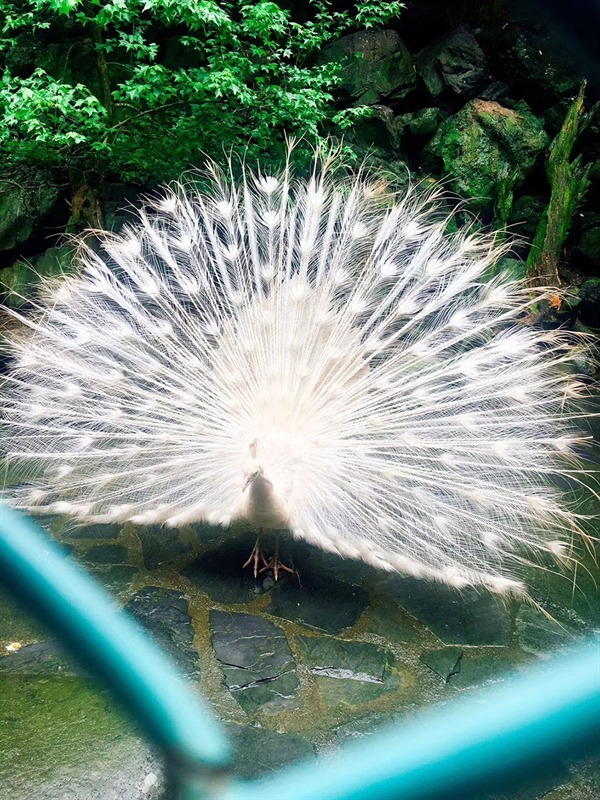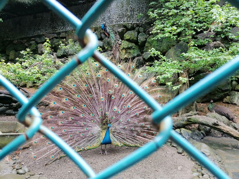 接着我们走依次走过了“禅廊”、“醉景园”。在醉景园中小朋友因未看到在偶然浮上水面的乌龟而难过,但这难过在看到孔雀的一瞬间消失殆尽。在孔雀开屏的一瞬间也不禁赞叹。连我都被吸引了,对面的女孩为何还不看过来。