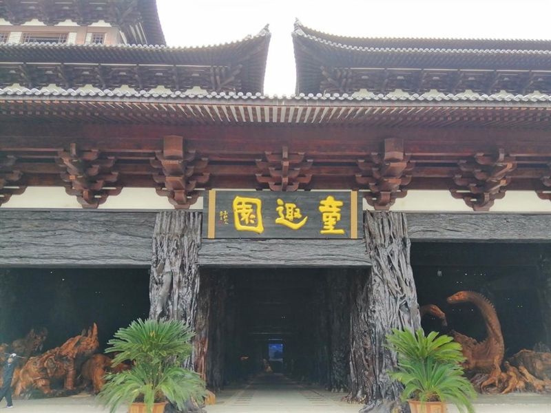 带着小朋友排队检票入门,映入眼前的是一扇门雕塑,其以徐大师的作品《世纪门》为原型,既寓意求知悟道之法门,又寓意吉祥幸福,再加之两旁的奇石,茶文化雕塑以及地上的八卦图,共同组成了第一个景点——福门祥光,立于这天地间。小朋友迫不及待的要与“世纪门”合影,便在此处留下了自己的身影。小小的人儿站在边上更衬得门雕塑的高大。