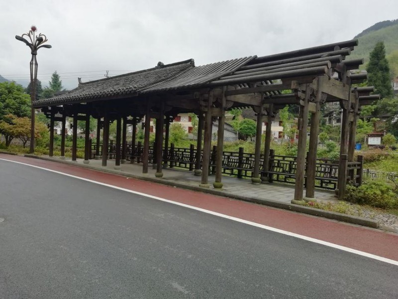 不远之处,是一排整齐排列的木拱廊桥以一种极具特色的形式散开来,廊桥没有顶只靠木柱支撑着与其他廊桥齐头并进。过了廊桥之后,便是一座木拱廊屋。整个廊屋上覆双坡顶,飞檐翘角,气势不凡,两侧铺设风雨板,以防止风雨雪霜对木制壳体的侵蚀。没想到小小的廊桥之间也有这么多门道,用科学的方式完美的让廊桥能保存的更加完整。