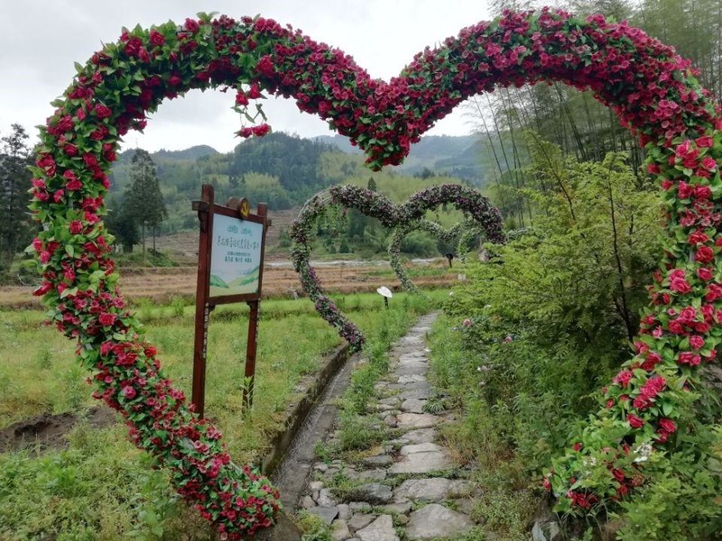 沿着心形路灯一直往前走,便是马坑村,随处可见的黄色小雏菊仿佛是这个季节特有的标志,给这个季节增添了无限色彩。过了一座三檐廊桥。入了心门便是进入了马坑村。一排排整齐排列的刷的粉白的楼房。家家户户门口的围栏之中,开的正是灿烂的各色玫瑰,粉的,白的,红的,开了个满园,花瓣也抖落的满地都是。如霜飞雪,落在底下厚厚的泥土之上。