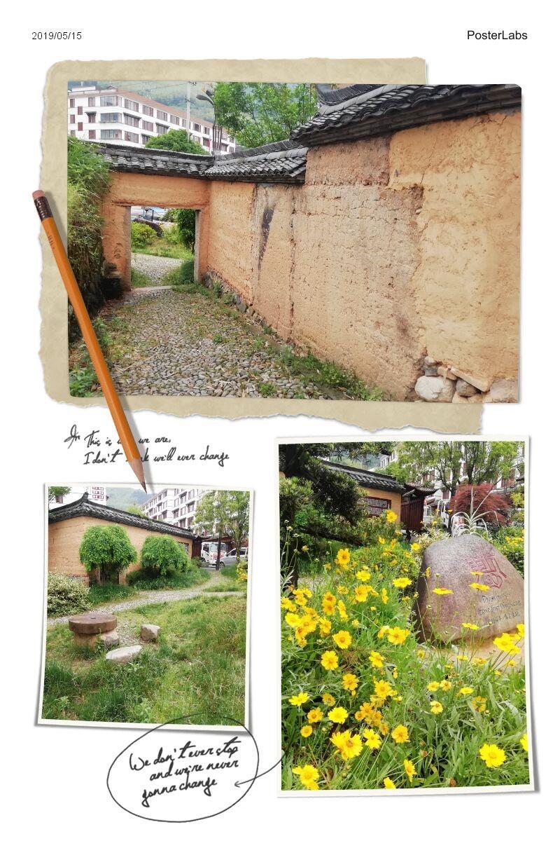 小园子里的小雏菊开的正是灿烂,被小雏菊围绕的中心点有一块刻着东坑两个字的石碑。小雏菊紧紧的挨着,给它增添了几分色彩。园中青草依依,绿色铺满了整个地面,走在鹅卵石的地面上,看着脚底下的图案。站在心形的图案之中,感觉刚下过雨的空气中都弥漫着甜甜的味道。穿过一道小门,门后是一垛黄土泥墙,低矮的屋檐之下,黄土泥墙之上沟壑纵横,斑斑驳驳之上皆是岁月的痕迹,我走在鹅卵石铺就的地面上,一只蝴蝶朝着我缓慢的飞过来,我伸出手,它便落在我的指尖上。